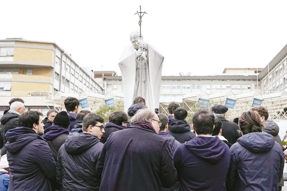 Fieles oran por Francisco en el frente de la Policlínica Agostino Gemelli.