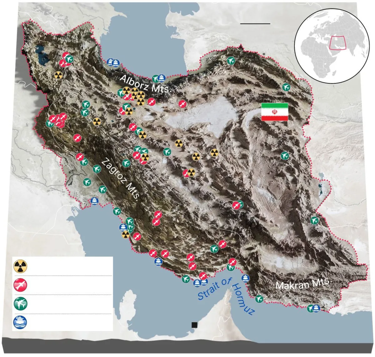Topográficamente Irán es mucho más complicado para cualquier ejército que su vecina Irak, donde predominan los valles fluviales y los desiertos planos. El norte del país, donde se encuentra la capital, está protegido por la cordillera de Elburz, que se extiende a lo largo de 600 kilómetros como una muralla desde las fronteras de Turquía y Azerbaiyán en el noroeste hasta el mar Caspio con alturas superiores a los 3.000 metros.