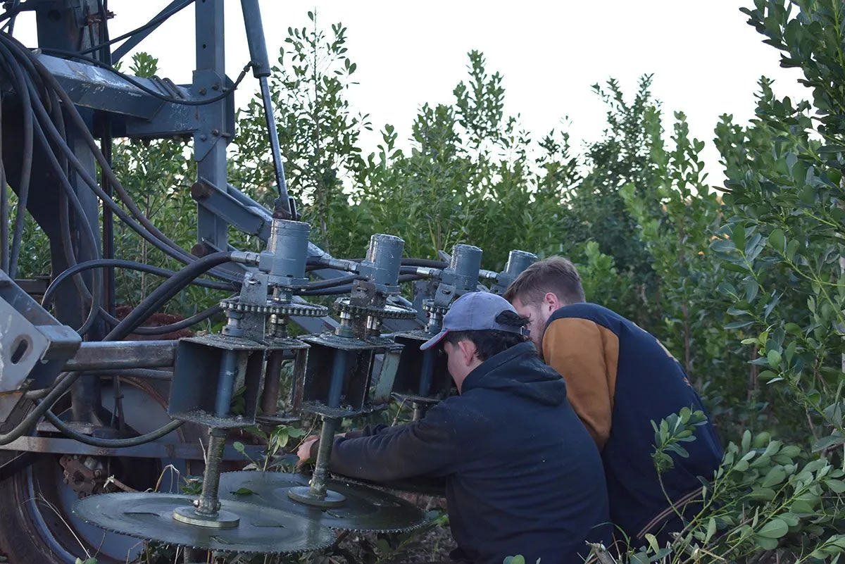 El implemento, tiene la capacidad de cortar gajos de gran tamaño con varios niveles de atura. En ese sentido, Cristian explicó que su funcionamiento es hidráulico y detalló alguna de las piezas principales que la componen. “Le colocamos circulares en frente, primero probamos con cuatro, ahora con tres para que pueda podar la planta acompañando el desnivel del suelo lo que permitirá cosechar sin problemas después con la cosechadora mecánica”, destacó el joven.