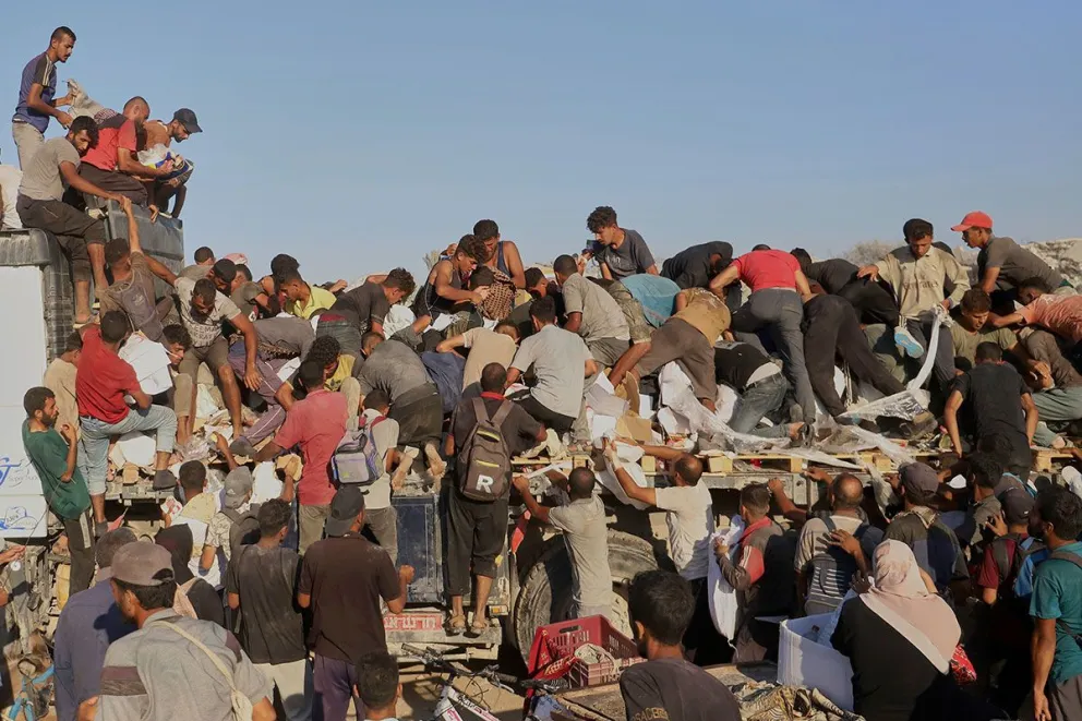 Una multitud desbordante se reparte comida desde la parte trasera de un camión. Foto: AP